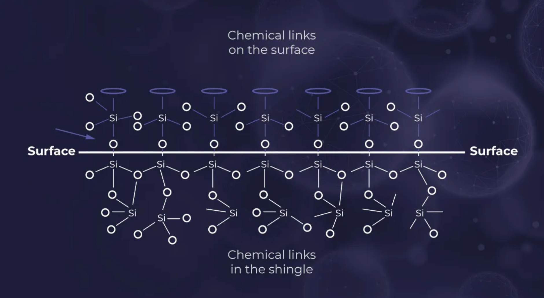 The evolution of GoNano technology created a shift in how sealants are approached. A regular shingle is sealed with oil, filling up the space in between shingles. GoNano modifies the molecular structure of asphalt shingles permanently. After application, a reaction occurs within each shingle. This reaction fuses both organic and inorganic material, creating new chemical links, called S1 particles. These S1 particles link shingle granules together, working from the inside out, creating a unified barrier against environmental strains and saving you money by extending the lifespan of your roof.